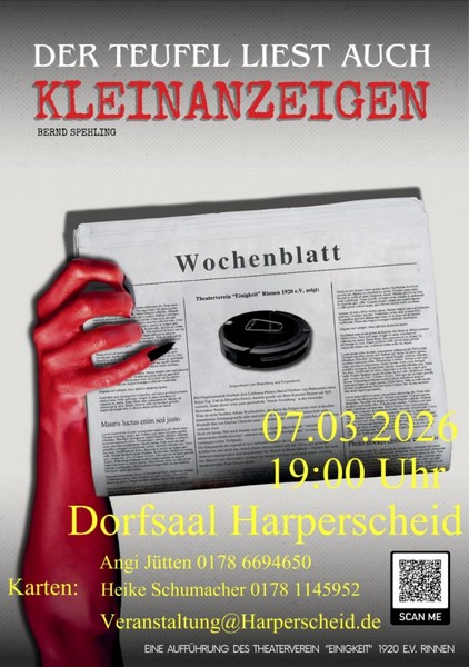 Im März haben wir Theater für Euch im Programm. Zusätzlich zum nicht regelmäßig geplanten Kabarett (Weibsbilder, Eifel-Gäng u.a.) gibt es einen Auftritt des Theatervereins Einigkeit Rinnen 1920 e.V.